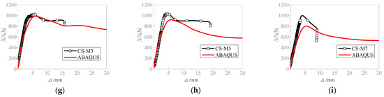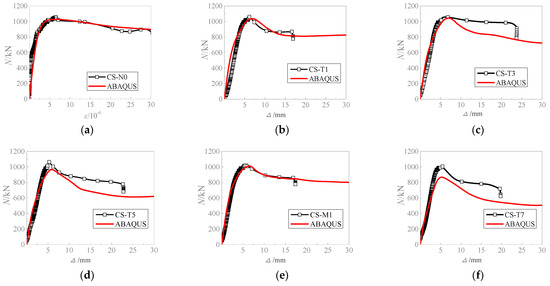 Figure 9 presents the load–displacement relationship curves of corroded CFST columns. The experimental data are in good correlation with the finite element simulation results, indicating that the peak load values from the tests are close to the simulated values.