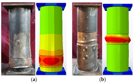 Figure 10 presents a comparative analysis between finite element simulations and experimental damage patterns of corroded CFST columns. Experimental observations indicate that at approximately 50% of the ultimate load, the end region of the specimen initiates a minor bulge, which progresses to a pronounced annular bulge deformation as the load increases, finally leading to specimen failure. The finite element simulation’s maximum stress contour plot reveals stress concentration in the end corrosion region, with the simulated damage morphology closely matching the experimental outcomes. Figure 10b illustrates the scenario where the local corrosion region is positioned in the middle of the specimen. The final damage morphology of both the test and numerical simulation is the ring buckling of the local corrosion region. The computational results of the FEA model are in good agreement with the test results.