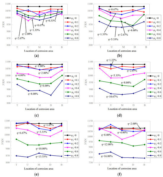 Figure 12 presents a diagram depicting the change in axial compressive load-bearing capacity for CFST columns with local corrosion at different locations. The Figure reveals that the load bearing capacity diminishes as the wall thickness corrosion rate increases. At low corrosion rates (), the load-bearing capacity is minimally affected by the location of corrosion, with the maximum reduction being no more than 5%. Typically, the most detrimental location for local corrosion is in the middle-region of the CFST column length (M). With the increase in the corrosion rate, the location that has the most significant impact shifts gradually; generally, corrosion in the middle-region of the specimen (U, M, D) exerts a more pronounced effect on the load-carrying capacity than that at the ends (T, B). This susceptibility is likely due to the mid-section region being more prone to stress concentration and local buckling under axial compression, resulting in a diminished load-carrying capacity. Nevertheless, the variation range of the load-carrying capacity of each CFST column with the same corrosion rate at different positions is still within 10%.