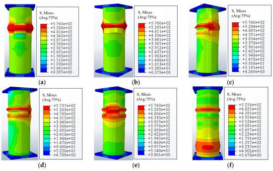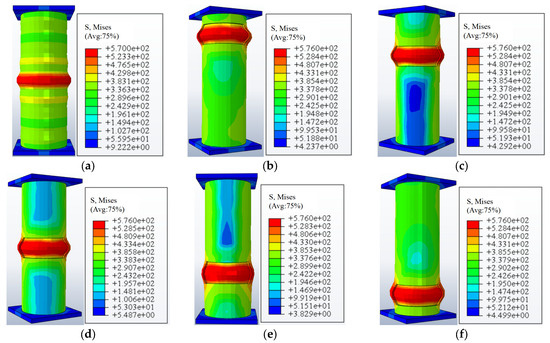 Stress distribution diagram of CFST columns with different local corrosion locations. (a) uncorroded. (b) Top end. (c) Upper middle. (d) Middle. (e) Lower middle. (f) Bottom end.