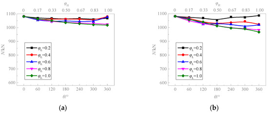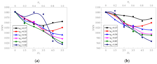 Figure 14 presents the variation curves of the load-bearing capacity of CFST columns across different circumferential corrosion ratios. With the increase of the circumferential corrosion ratio, the load-bearing capacity shows a distinct downward trend. Notably, at a low wall thickness corrosion rate, as shown in Figure 14a,b, the influence of the circumferential corrosion ratios on the load-carrying capacity is minimal, and the maximum reduction is less than or equal to 10%. In addition, when the axial corrosion ratio exceeds 0.2, the load-bearing capacity curves tend to converge. This indicates that under conditions of higher corrosion rates, the circumferential corrosion ratio has a more substantial impact on the specimen-bearing capacity than the axial corrosion ratio.