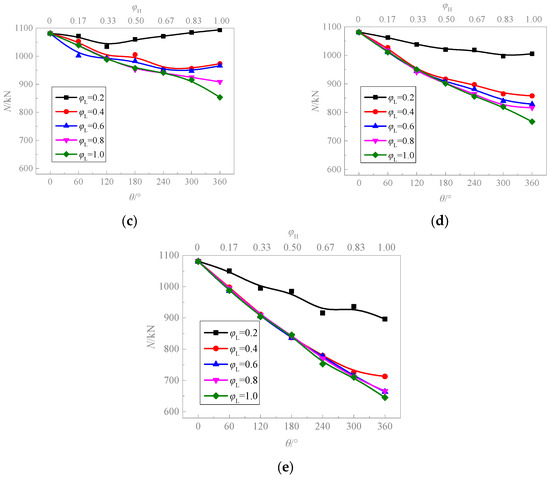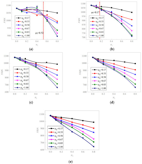 Change curve of the bearing capacity of CFST columns with φH. (a) φT = 0.1. (b) φT = 0.2. (c) φT = 0.4. (d) φT = 0.6. (e) φT = 0.8.