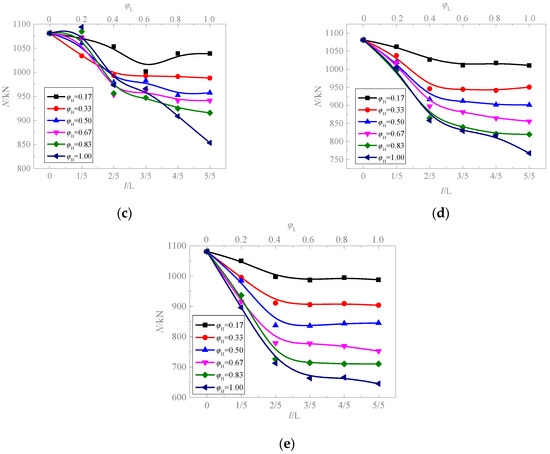 Change curve of the bearing capacity of CFST columns with φT. (a) = 0.2 (l = L/5). (b) = 0.4 (l = 2L/5). (c) = 0.6 (l = 3L/5). (d) = 0.8 (l = 4L/5). (e) = 1.0 (l = L).