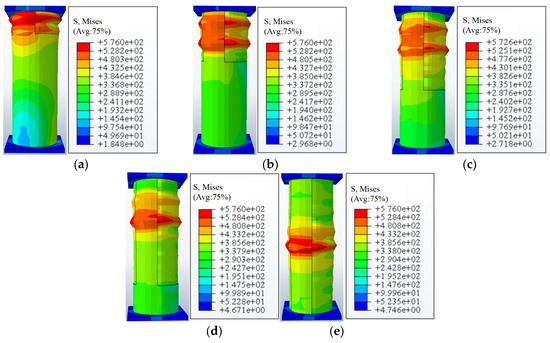 Figure 13 illustrates the stress distribution, represented by stress cloud, for the CFST columns under axial compression, with variations attributed to different local corrosion locations. The local corrosion regions are characterized by a wall thickness corrosion rate (φT) of 0.8, an annular corrosion ratio (φH) of 0.33, and an axial corrosion ratio (φL) of 0.2. Figure 12 illustrates that uncorroded CFST columns typically manifest central drum-type buckling damage when subjected to axial compression. However, introducing local corrosion defects to the column surface leads to abrupt alterations in the cross-section. The presence of local corrosion defects on the surface of a steel tube can lead to abrupt changes in the cross-sectional area. These variations can weaken the confining effect of the outer steel tube on the core concrete, simultaneously disrupting the path of axial stress transfer within the structure. This results in uneven stress distribution around the corroded area, with local stress concentrations occurring at the edges of the corrosion area. As a consequence, the steel tube in the corroded region reaches the yielding stage at lower loads, which adversely affects the specimen’s load-carrying capacity. Local corrosion significantly modifies the mechanical response of the CFST specimen. It not only diminishes the load-carrying capacity but also induces a shift in the failure mode. Instead of occurring in the central region, buckling damage at the time of specimen failure is shifted to the cross-section containing the local corrosion area.