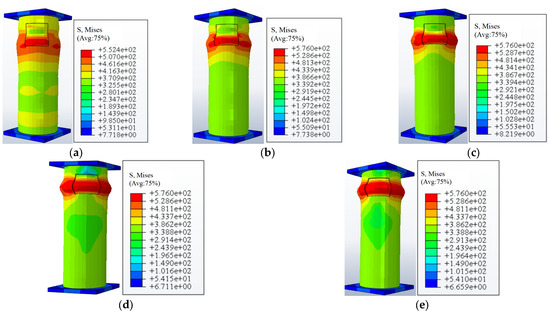 Stress distribution diagram of CFST columns with different wall thickness corrosion rates. (a) φT = 0.1. (b) φT = 0.2. (c) φT = 0.4. (d) φT = 0.6. (e) φT = 0.8.