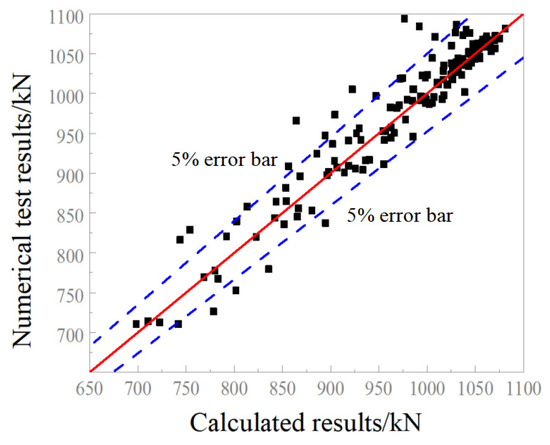 Figure 20 presents a comparison between the calculated results derived from the proposed formula (Equation (5)) and the numerical test results, including a 95% confidence interval. The Figure reveals that 93.2% of the data points fall within this confidence interval, signifying that the formula is highly reliable in capturing the trend of the numerical test results. The calculated values closely align with the finite element simulation results, with a ratio ranging from 0.89 to 1.07.