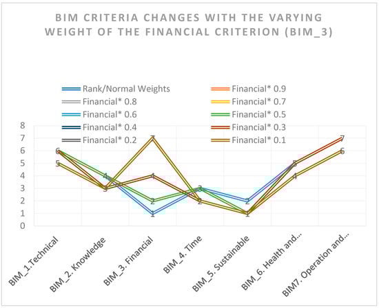 - Highly financial-dependent criteria: Sub-criteria like c3 (changes order and rework management) and c5 (real-time cost reporting and life-cycle cost analysis) are highly dependent on the financial criterion. As the financial weight decreases, their relevance diminishes dramatically, which is indicative of their strong connection to financial management capabilities.