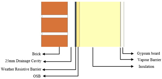 The cross-section of the brick veneer-clad wall assembly, which consists of a layer of brick veneer cladding, a 25 mm air cavity, an asphalt-impregnated paper-based membrane (30 min), an 11 mm (3/8″) thick Oriented Strand Board (OSB), 51 mm × 152 mm (2″ by 6″) wooden stud frames, and a 12.7 mm (1/2″) gypsum board.