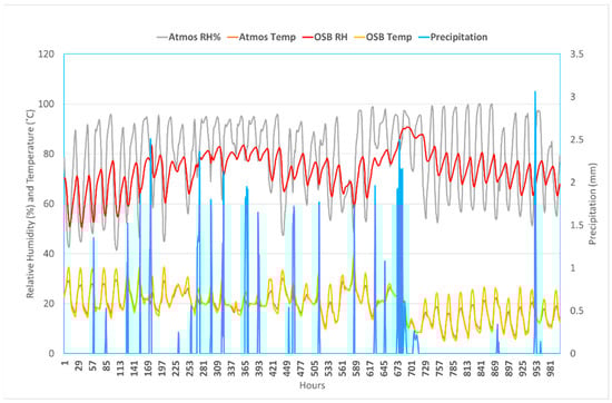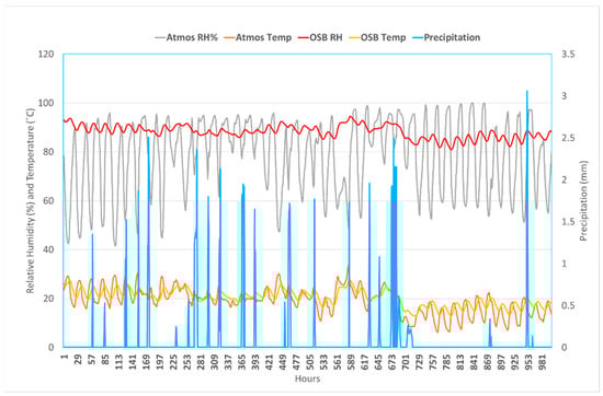 Relative humidity and temperature profiles on the OSB of the vinyl-clad wall assembly with a 200 ACH between the 15,500th and 16,500th hours (September–October 2035). The plot also includes relative humidity, temperature, and precipitation profiles from the atmosphere.
