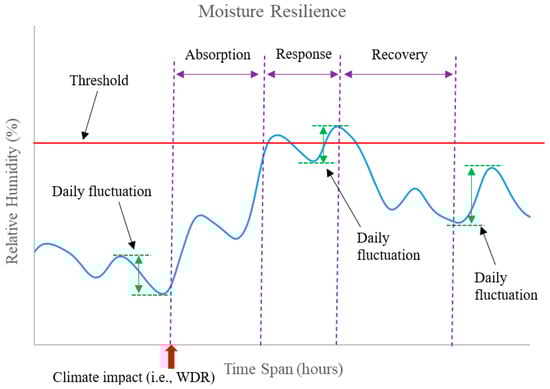 Therefore, the relative humidity should be used as the key parameter for assessing the moisture resilience of the wall assembly. In line with the definition of resilience in other aspects related to building performance, and since the growth of mould hinges on the relative humidity attaining a specific level at a given temperature, the evaluation of the moisture resilience of a wall assembly, considering that OSB is a critical component of the assembly, should encompass three essential aspects: (i) absorption—the ability of the wall to maintain a lower level of relative humidity on the OSB due to the climate impact; (ii) response—the degree of fluctuation of relative humidity on the OSB; and, (iii) recovery—the rate at which the relative humidity decreases and recovers from a critical level after a WDR event has occurred. A diagram depicting different aspects of moisture resilience is shown in Figure 4. These aspects reflect the risk as determined by the duration in time of the relative humidity, surpassing a critical threshold level.