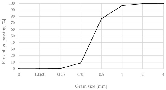 Vistula river sand 0/2 was used as a fine aggregate, with its properties confirmed according to various standards—PN-EN 933-1 (granulation) [24], PN-B-06714-46 (alkali-silica reaction) [25], and PN-EN 1744-1 (organic pollutants content) [26], among others. The water used in this study met the requirements of PN-EN 1008 [27]. The grain size distribution curve of the sand is presented in Figure 1.
