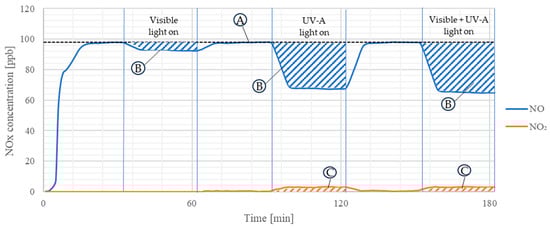 A schematic of the test procedure for air purification from NOx in different irradiation conditions; A—constant flow of 2 L/min of approx. 100 ppb of NO in the reaction chamber; B—reduction in the concentration of NO due to specific irradiation (visible light, UV-A light, and combined visible and UV-A light; and C—generated NO2 due to photocatalytic reactions. Based on marked areas (blue and orange), the amount of both removed NO and generated NO2 per hour per m2 of photocatalytic surface was calculated.