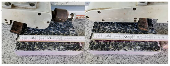 Once the height was set, the pendulum arm and measurement indicator were rotated counterclockwise until the pendulum arm was secured in the gripping block and the indicator rested on the gripping block arm. To begin the measurement, the pendulum arm was released and then caught on its return swing before the rubber slider touched the test surface again. The measurement was performed four times on the dry surface of the sample and then four times on the wet surface. If any result deviated significantly, the measurement was repeated until four consistent results were obtained. A total of eight measurements were conducted for each sample.