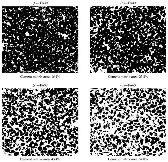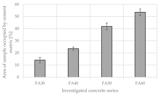 Depending on the concrete mix composition, the surface area occupied by the cement matrix varied (Figure 7). A quasi-linear increase in the cement matrix area was observed as the fine aggregate content in the mix increased. When the fine aggregate content rose from 30% to 60%, the cement matrix area increased significantly—from an average of 14.1% to 53.5% of the total sample surface area.