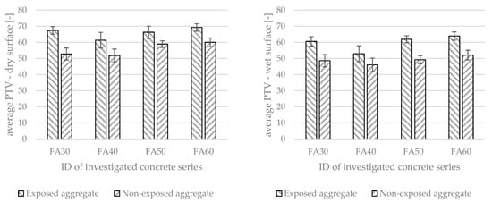 The change in the test conditions—wetting the external surface of samples—contributed to a deterioration in slip resistance; however, the reduction in PTV was not significant. The change in PTV obtained under different surface conditions was greater for series with exposed aggregate on their surface compared to reference series, approx. four to eight units lower than for tests conducted in dry conditions. In both conditions (dry and wet), all concrete series were characterized by a higher slip resistance than reference series.