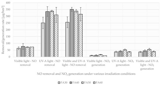 Based on performed tests, the NOx selectivity index of investigated photocatalytic surfaces during conducted tests was calculated according to Equation (3), linking the mass of the removed NO with the mass of the generated NO2 during the photocatalytic process in different light conditions (Figure 12).