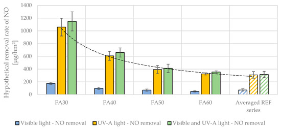 Series with exposed coarse aggregate differed significantly in air purification properties. With the increase in the area of exposed coarse aggregate on the sample’s photocatalytic surface (the reduction in the area of photocatalytic cement matrix), the efficiency of NO removal decreased (Figure 11). This trend was most visible when carrying out the irradiation of concrete samples with UV-A and combined light sources (visible light and UV-A). All samples with exposed coarse aggregate, under all irradiation conditions, were characterized by a lower NO removal rate than in the case of appropriate reference series. As an example, reference series FA50, under UV-A light, was able to remove approx. 338 µg/hm2 of NO, while a series with the same composition but with an exposed aggregate in the same light conditions was able to remove approx. 162 µg/hm2 of NO. A similar dependency was observed for all of the analyzed concrete series.