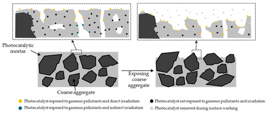 Impact of coarse aggregate exposure on photocatalyst availability to gaseous pollutants and sun irradiation.