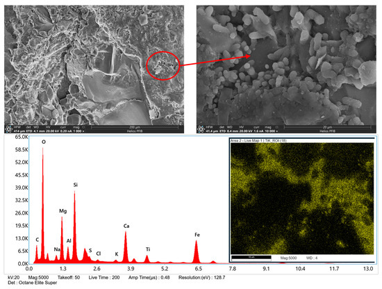 SEM micrograph of basalt coarse aggregate grain removed from the external surface of a sample with exposed aggregate with EDS analysis showing Ti presence on the external surface of the grain.