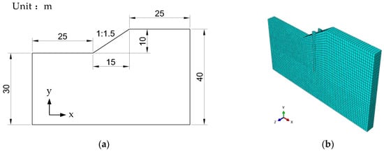 Some researchers [20] compared the bending capacity, economic efficiency, and construction duration of three different pile cross-sections and concluded that circular piles are more cost-effective, improve construction efficiency, and adapt better to varied terrain. This study focused on circular piles. A half-pile modeling approach was adopted to reinforce the unstable slope. The slope model remained unchanged, and the pile spacing was set equal to the slope model’s thickness (4 m). The boundary conditions of the slope also remained unchanged. The interaction between the piles and the slope soil was modeled as frictional contact, with normal contact defined as “hard” to transmit pressure, and a tangential friction coefficient of 0.3. The simulation consisted of two analysis steps: acquiring the initial geo stress and reducing the soil strength.