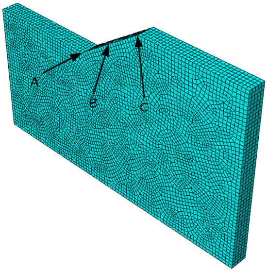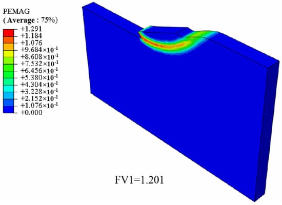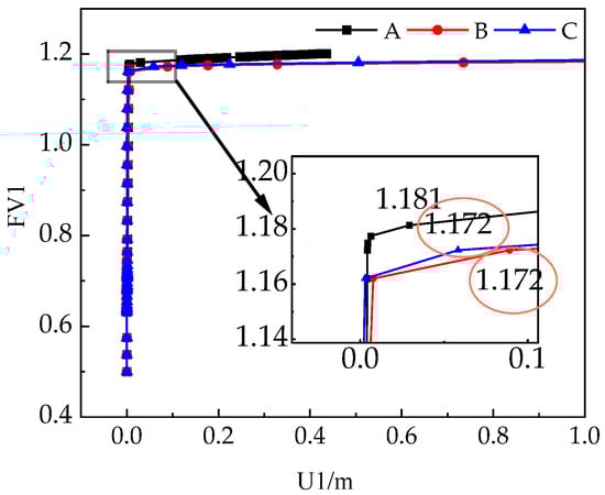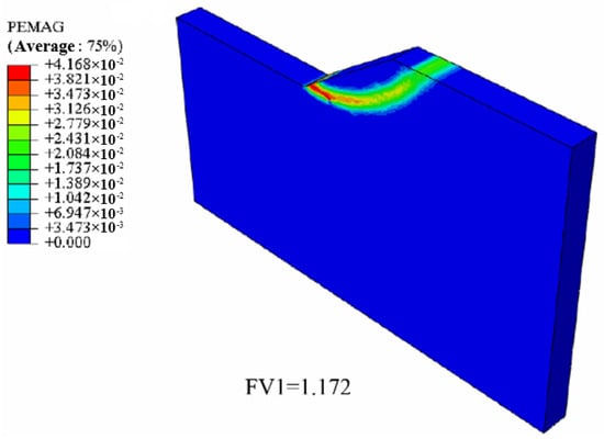 Three characteristic points on the slope were selected to determine the onset of rapid displacement increase, as shown in Figure 2: the slope toe (point A), the mid-slope (point B), and the slope crest (point C). The slope safety factor at the time of instability was confirmed through the FV1-U1 curve, as depicted in Figure 3. The slope crest (C) and mid-slope (B) entered instability at a safety factor of FV1 = 1.172, while the slope toe (A) became unstable at FV1 = 1.181. Therefore, FV1 = 1.172 was selected as the critical safety factor corresponding to the onset of rapid displacement. This observation suggests that the slope crest and mid-slope are more prone to failure when instability occurs. When the numerical model failed to converge, the safety factor was FV1 = 1.201 (Figure 4). When the plastic zone formed a continuous connection through the slope (Figure 5), the safety factor was FV1 = 1.172, consistent with the value at which rapid displacement occurred. Therefore, the critical safety factor for slope failure in this typical model is FV1 = 1.172. Among the three evaluation methods, the safety factor obtained using the non-convergence criterion was higher, but it may not accurately reflect the actual instability conditions. Hence, relying solely on this method could be dangerous, and a combination of the other two methods should be used to assess slope instability accurately.