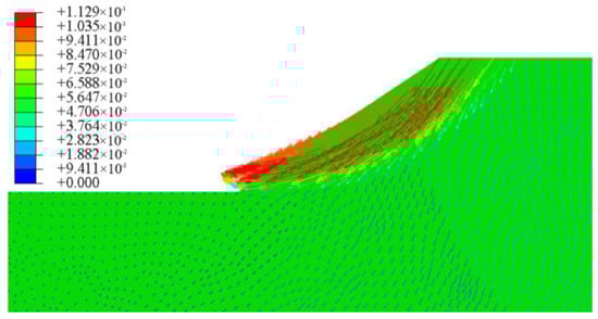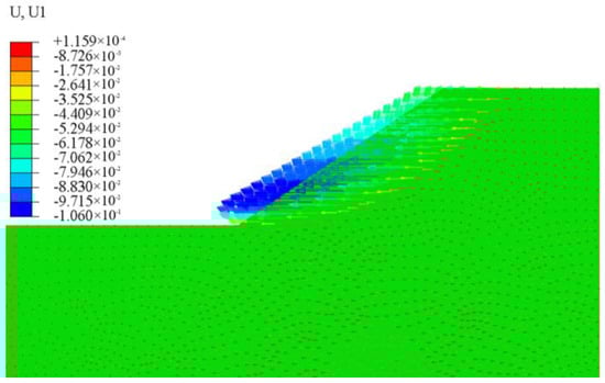 From Figure 6 and Figure 7, it can be seen that, when slope instability occurs, the type of landslide is a translational slide. After the upper soil becomes unstable, it slides downward along the slope, acting on the middle and lower parts of the soil, causing a progressive failure. The maximum horizontal displacement occurs at the bottom, accounting for 93.88% of the total displacement.