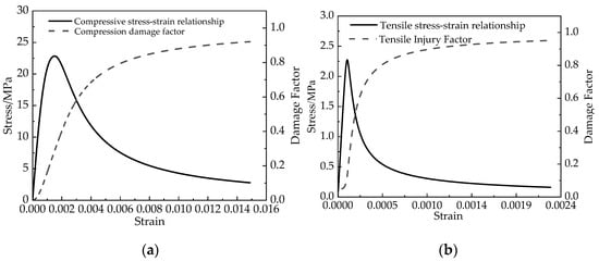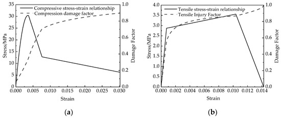Stress–strain and damage factor curves of concrete: (a) C30 concrete compressive stress–strain and damage curves; and (b) tensile stress–strain and damage curves for C30 concrete.