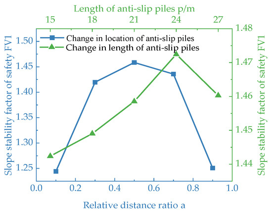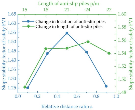 - High-toughness material anti-sliding piles exhibit superior mechanical properties compared to conventional concrete anti-sliding piles. At a = 0.5, the application of high-toughness material anti-sliding piles achieves a stability safety factor FV1 of 1.54822, reflecting a 32.10% improvement over the unreinforced slope and a 7.55% improvement over conventional concrete anti-sliding piles. The maximum safety factor is 1.55804 when the pile length is p = 24 m;