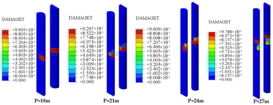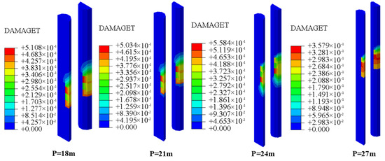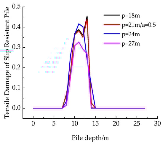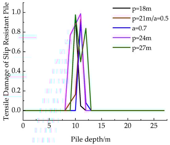 From Figure 16, it can be seen that, in the simulation calculations for five different lengths of anti-sliding piles, except for the case where p = 15 m, the tensile plastic damage in anti-sliding piles exceeds the failure threshold of 0.8, indicating tensile failure. The damage areas are mainly concentrated within 10 m from the top of the anti-sliding pile, while no compressive damage occurs in the piles.
