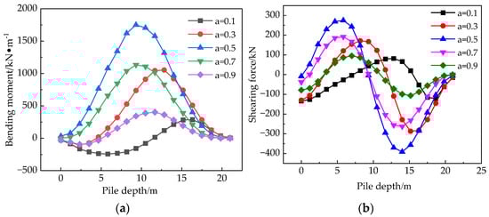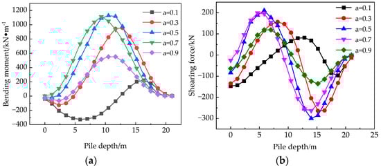 As illustrated in Figure 20a,b, the bending moment and shear force of high-toughness anti-sliding piles reach their maximum at a = 0.5, with the maximum bending moment of 1752 kN/m and the maximum shear force at 391.1 kN. This finding represents an increase of 35.61% and 30.41%, respectively, compared to conventional concrete piles, attributed to the superior tensile and flexural toughness of the high-toughness cement-based composite materials, enabling them to withstand greater bending moments and shear forces.