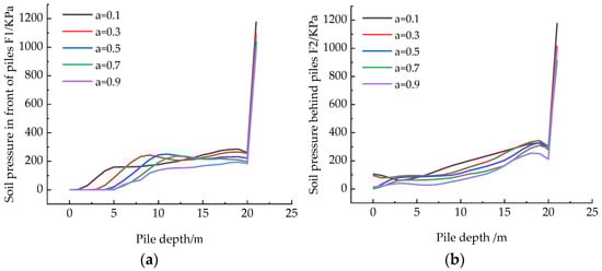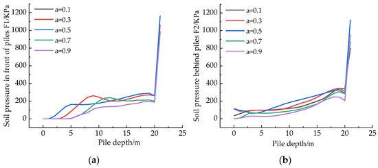 From Figure 12a,b, it can be observed that, when the anti-sliding pile is subjected to the action of the sliding soil mass, both the soil stress F1 in front of the pile and the soil pressure F2 behind the pile initially rise before exhibiting a slight decline until a depth of 20 m. This behavior may be related to the detachment that occurs following the deformation of the concrete elements. However, when the pile depth exceeds 20 m, both F1 and F2 experience a sudden increase. The peak soil pressure F1 in front of the pile decreases with an increasing relative distance ratio a; thus, that is to say, the closer the anti-slip pile is to the lower position of the slope, the greater the landslide soil force it is subjected to. The soil pressure F2 behind the pile is minimized at a = 0.5 and a = 0.7, which are also the positions where the arching effect of the anti-sliding pile is most significant.