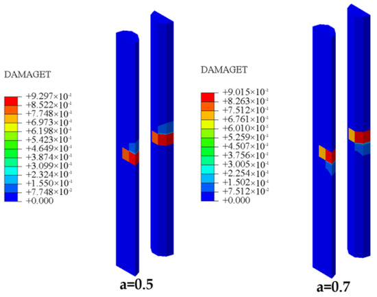 The plastic damage analysis of anti-sliding piles at different positions, as shown in Figure 13, indicates that, when a = 0.5 and a = 0.7, the tensile damage significantly exceeds the failure threshold of 0.8, resulting in pronounced bending and tensile failure. This finding correlates with the substantial arching effect observed, which significantly enhances the slope stability safety factor FV1. In other positions, no noticeable plastic damage occurs in the anti-sliding piles. During the process of stabilizing the slope, the concrete anti-sliding piles did not exhibit compressive damage, with all compressive damage values remaining below 0.1, indicating that they were in a safe compressive state.