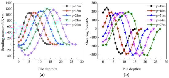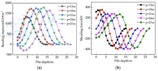 The distribution of bending moments and shear forces of anti-sliding piles at different lengths concerning pile depth is illustrated in Figure 14a,b. From the content of this figure, it can be observed that, when the length of the anti-sliding pile reaches 24 m, the maximum bending moment and shear force are achieved, with a maximum bending moment of 1207 kN/m and a maximum shear force of 311 kN. This finding indicates that, when p = 24 m, the anti-sliding pile exerts the greatest earth arch effect to stabilize the sliding slope. The distribution of bending moments and shear forces under the action of sliding soil remains nearly consistent across different pile lengths.