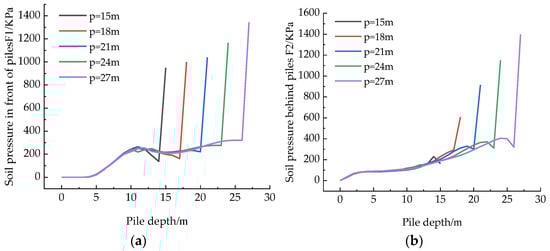 As shown in Figure 15a,b, compared to the soil pressure distribution of the pile when the position of the anti-sliding pile is altered, the distribution of soil pressures when changing the length of the anti-sliding pile exhibits a more pronounced correlation with pile length, primarily reflected in the back soil pressure. The peak value of the back soil pressure increases with the length of the anti-sliding pile. When p = 15 m, there is no significant increase in back soil pressure; the pile is too short to reach the plastic zone of the soil slope, rendering it unable to stabilize the slope effectively.