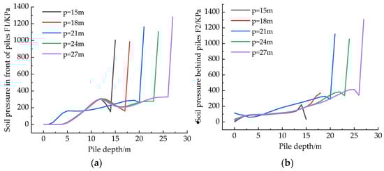 As shown in Figure 23a,b, after changing the length of the anti-sliding piles, the pile front soil pressure F1 experiences a sharp peak increase at the pile base. At lengths of p = 15 m and p = 18 m, the pile back soil pressure F2 does not show a sharp increase, possibly due to soil bending causing a gap, which prevents the pile from effectively stabilizing the soil.