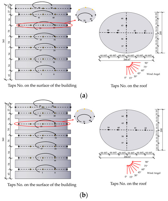 Distribution of pressure taps on the surface of the vertical farms: (a) model A, (b) model B.