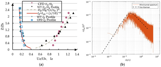 (a) Mean wind speed profile and turbulence intensity profile, and (b) longitudinal wind velocity spectrum at the h = 360 mm of the model.