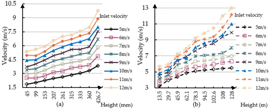 Wind speed at different inlet velocities of each test layer in (a) wind tunnel tests and (b) CFD simulations.