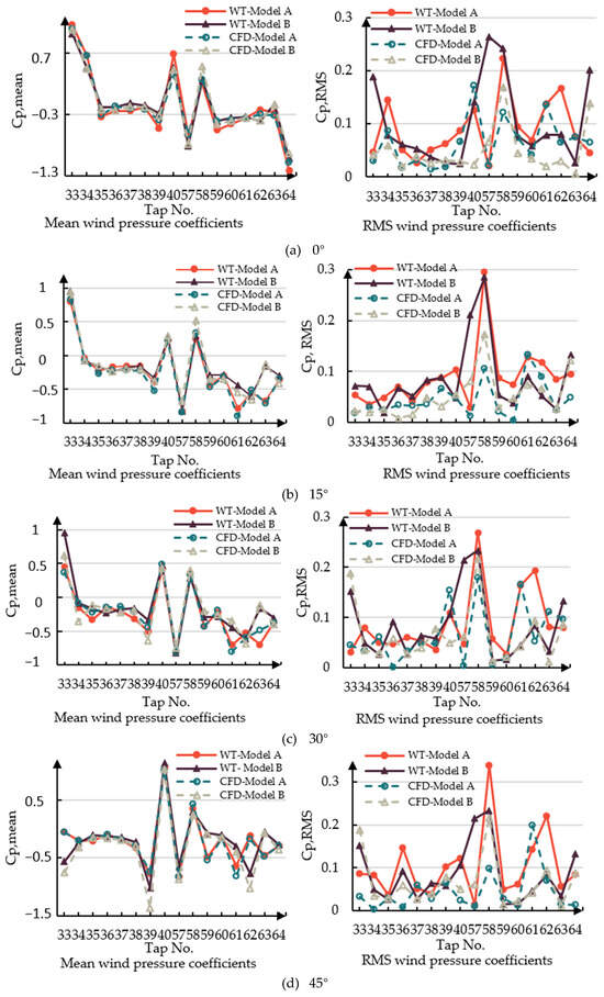 Comparisons of mean wind pressure coefficients obtained by wind tunnel tests and CFD in different angles.