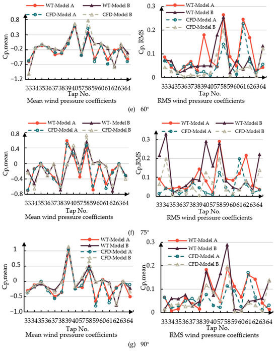 Figure 6 shows the variation in the mean and RMS fluctuating (standard deviation) wind pressure coefficients recorded from taps nos. 33~40 on the surface of the vertical farm building and from taps nos. 57~64 on the roof at an inlet velocity of 10 m/s. The results are compared with the results of the CFD simulation. The results of the wind tunnel test and the CFD simulation are compared and the numerical trends of the results of the two models in the two test environments are in good agreement. The main characteristic difference between the two circles of model A and model B is the height of the ventilation corridor at 15 F, which corresponds to taps nos. 33~40. Tap no. 33 is the measuring point on the windward side, facing the incoming flow, and tap no. 37 is the measuring point on the leeward side, furthest away from the incoming flow. From the numerical values, model A has a larger wind pressure coefficient for the frontal windward side compared to model B, while the wind pressure coefficient for the leeward side is not very different.