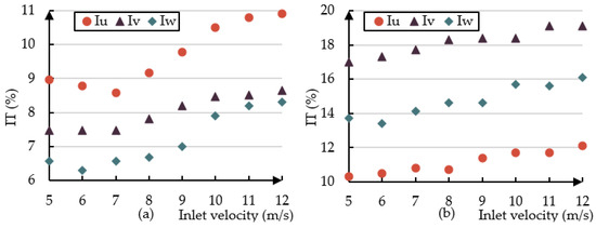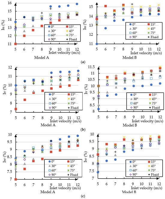 Figure 7 shows the values at different inflow velocities for roof height and is compared for model A and model B, respectively. The results confirm that the turbulence intensity on the downwind side is generally larger than the turbulence intensity on the upwind side and the vertical turbulence intensity at the same inlet velocity. The experimental data show that in model A the values of turbulence intensity in , , and are highest in the 0° wind direction and lowest in the 15° wind direction, while in model B the values are highest in the 45° wind direction and lowest in the 0° wind direction. One possible reason for this phenomenon is that the geometry changes between 14 F–16 F for model B affects the airflow at the roof level, and such a concave profile increases the depth of the shear layer, leading to a decrease in turbulence intensity. It has been shown that building features such as roof geometry and balconies influence the turbulence intensity in the inflow. The presence of balconies, or otherwise façade misalignment by the section narrowing, reduces the turbulence intensity in the street canyon [56].
