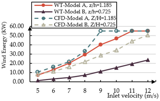 Figure 10 shows the wind energy potential associated to a V15 wind turbine installed on model A at z/h = 1.185 (roof) and model B at z/h = 0.725 (façade), on both the experimental models tested in the wind tunnel tests through a previous CFD simulation [42]. According to these results, the total wind energy that can be harvested gradually increases as the inlet speed increases, with best results observed when the inlet wind speed exceeds 8 m/s. The rate of change on the experimental and numerical simulations could be due to the fact that the turbulence caused by the scaled-down wind tunnel test model is larger than in the CFD environment, and the wind speed is greatly affected by the profile of the building shape when it flows through the two heights, so that the wind speed and the growth of wind speed are suppressed, resulting in a decrease in the captured wind energy.