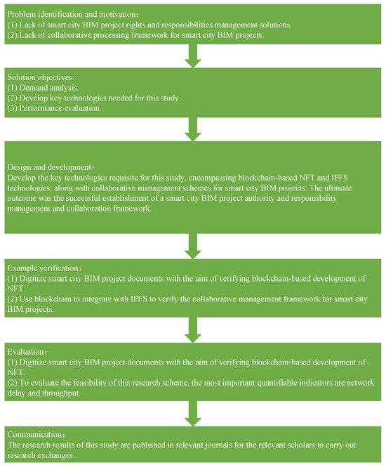 This study employs the design science research (DSR) methodology to construct and optimize a responsibility management and collaboration framework for BIM projects. DSR is a problem-solving academic paradigm that designs and implements innovative solutions, addressing practical issues while also advancing knowledge and theory in the academic field [46]. The primary objectives of this research are (1) to develop blockchain-based NFTs for responsibility management in BIM projects, (2) to utilize the IPFS to ensure distributed data storage and sharing, and (3) to create an integrated collaboration framework combining blockchain and BIM technologies. Guided by this research methodology, a comprehensive framework has been constructed, as illustrated in Figure 1.
