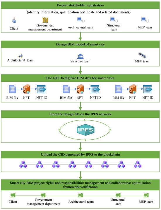 This study employs a design science research methodology to construct a comprehensive research framework and propose a blockchain-based solution aimed at optimizing responsibility management and collaboration security in Smart City BIM projects [20]. Blockchain technology provides an immutable record for BIM models through cryptography, ensuring that the model’s content cannot be altered. Furthermore, each BIM model team holds clear responsibility for the models they manage. Specifically, this study develops a blockchain-based non-fungible tokens (NFTs) system to manage the responsibilities within smart city BIM projects. Blockchain technology and NFTs offered effective solutions for the challenges in BIM projects, particularly in responsibility management, data security, and collaboration. Blockchain’s transparency established a reliable mechanism for accountability among stakeholders, allowing responsibilities to be encoded through smart contracts. This ensured that all changes to the BIM model were timestamped and linked to specific individuals or teams, enabling precise identification of responsible parties when errors occurred, thereby reducing ambiguity and disputes. NFTs facilitated secure transactions by representing ownership of digital assets within the BIM environment, with each NFT containing relevant metadata such as ownership history and licensing agreements. The decentralized nature of blockchain promoted seamless collaboration by providing real-time access to a tamper-proof database, minimizing data synchronization issues. Integrating NFTs allowed for the direct transfer of ownership of digital assets, simplifying workflows and reducing administrative burdens. As digital assets faced risks of unauthorized copying, NFTs provided solutions through unique identity verification, ensuring that only legitimate users could access digital content and protecting stakeholders’ intellectual property rights. To address the security issues of BIM data in collaborative work, this study further utilizes InterPlanetary File System (IPFS) technology to fingerprint BIM data. This process involves the distributed storage and encryption of BIM data, followed by the uploading of the fingerprint information to the blockchain network. This method achieves a high level of decentralization, mitigating the risk of single-point failures and ensuring the security and immutability of data in multi-party collaborations. By integrating blockchain and IPFS technologies, the proposed solution not only improves the management efficiency of BIM projects but also enhances the security and reliability of the data. This provides new technological pathways and management strategies for smart city construction. This innovative solution can significantly reduce the risks associated with project management, foster transparent collaboration among parties, and lay a solid foundation for the sustainable development of smart cities.