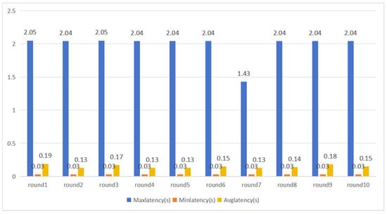 Network latency and throughput were critical metrics for evaluating network quality, with blockchain latency being particularly significant due to its direct impact on transaction efficiency and cost. High latency not only diminished user experience but also affected the overall system’s reliability and responsiveness. Therefore, strict control of latency was essential in blockchain applications. In this study, we conducted ten rounds of testing to measure blockchain transaction latency. The results indicated an average latency of 150 milliseconds. Figure 6 illustrated the latency distribution for all tested smart contracts, showing that their latencies were within acceptable limits. This latency performance validated the effectiveness and stability of the system in handling smart contract transactions, further supporting the feasibility and superiority of the proposed blockchain framework in practical applications.