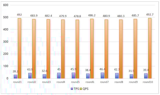 Throughput was a critical metric for assessing a blockchain network’s transaction processing capacity, typically evaluated through transactions per second (TPS) and queries per second (QPS). Figure 7 illustrated the test results, indicating that the blockchain network could process an average of 86 transactions per second and handle approximately 982 queries per second. This performance level demonstrated that the network could efficiently meet the processing demands of most applications. Specifically, an average of 86 TPS suggested that the system could handle 86 transactions per second, which was sufficient for many real-world scenarios. Additionally, the 982 QPS indicated that the system efficiently processed and responded to query requests, providing quick access to information. These results reflected the network’s strong performance in both transaction processing and query handling, demonstrating that it is capable of supporting high-frequency transactions and queries. However, it is important to note that latency and throughput could vary with changes in network configuration. Therefore, when setting up and deploying a blockchain network, careful consideration of hardware configurations, network environments, and system optimizations was necessary to ensure stable and efficient performance under different configurations.