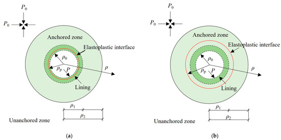 Mechanical model: (a) Mechanical calculation model with the plastic zone located within the lining; (b) mechanical calculation model with the plastic zone located within the anchoring zone.