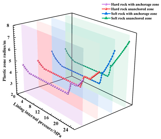 - In scenarios with or without an anchoring zone, under the action of the anchor bolt, when the specified lining internal pressure is less than the initial critical pressure, the primary stress is the circumferential stress, with the plastic zone located within the lining. The anchoring action does not significantly influence the expansion of the plastic zone, although it extends the Phase II interval length. When the specified lining internal pressure exceeds the secondary critical pressure, the first primary stress transforms into radial pressure. When the plastic zone extends to the anchoring zone, the anchor effectively inhibits plastic expansion under soft rock conditions. The plastic zone radius inhibition rate peaks at 14.97% and 4.92% in soft rock, and at 5.34% and 3.35% in hard rock;