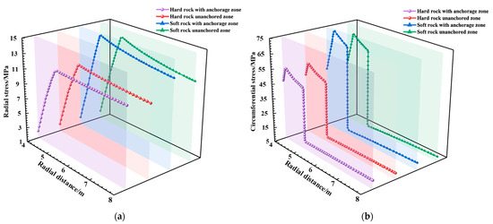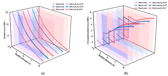 Evolution curve: (a) M-C criterion P = 2 MPa radial stress at different anchor support angles along the radial distance; (b) M-C criterion P = 2 MPa circumferential stress along the radial distance at different anchor support angles.