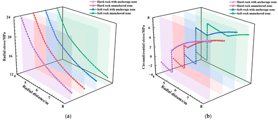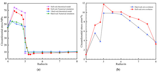 Figure 13 illustrates that the simulated circumferential stress in both scenarios is marginally lower than the theoretical values. The stress displays an initial increase followed by a decrease, reaching its maximum at the elastic–plastic boundary. Within the lining, the circumferential stress for soft rock is significantly larger than that for hard rock; however, in the anchoring zone, the circumferential stress for soft rock is marginally lower. The theoretical calculations exhibit a pronounced discontinuity at the interface between the lining and anchoring zone. This discontinuity manifests in the simulation as an abrupt increase in the rate of reduction of circumferential stress on either side of this interface, aligning closely with the theoretical model’s trends. Within the anchoring zone, circumferential stress increases and eventually aligns with the original ground stress level as the radial distance grows. In both computational scenarios, the maximum error for soft rock is 11.73%, while the minimum error is 1.00%; for hard rock, the errors are 9.85% and 1.00%, respectively. The calculation error for the soft rock supported by the lining-anchor support structure is slightly higher than that for hard rock. Additionally, the average error for hard rock is relatively small, amounting to 6.38%, compared to 7.66% for soft rock. The overall trend is consistent with the theoretical model. The errors in this study are relatively minor, with the average errors for both soft and hard rock kept within 10%. This further validates the effectiveness and reliability of the research method employed in this study.